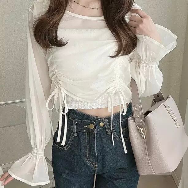 BL-0143 シースルー 長袖 ブラウス 短丈 レディース カジュアル シンプル 可愛い お洒落 きれいめ 大人 クール
