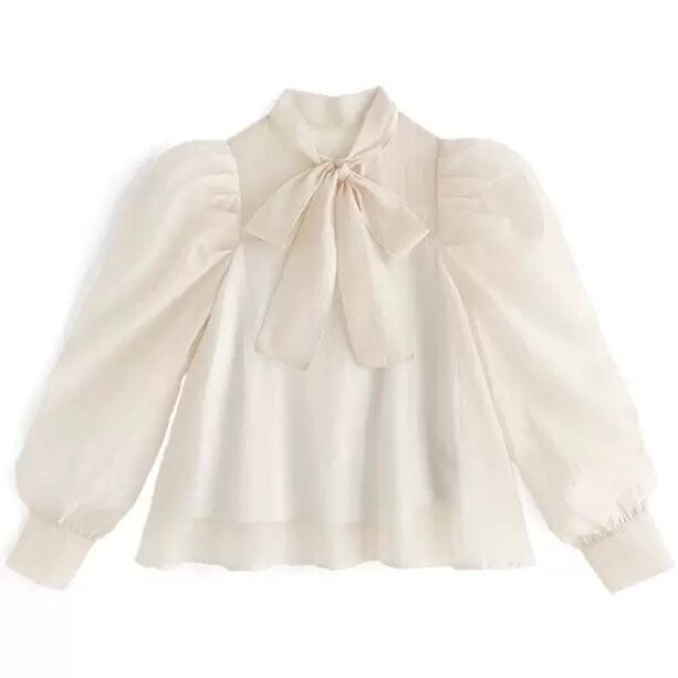 BL-0146 リボンシースルー ふんわり袖 長袖 ブラウス レディース カジュアル シンプル 可愛い お洒落 きれいめ 大人 上品