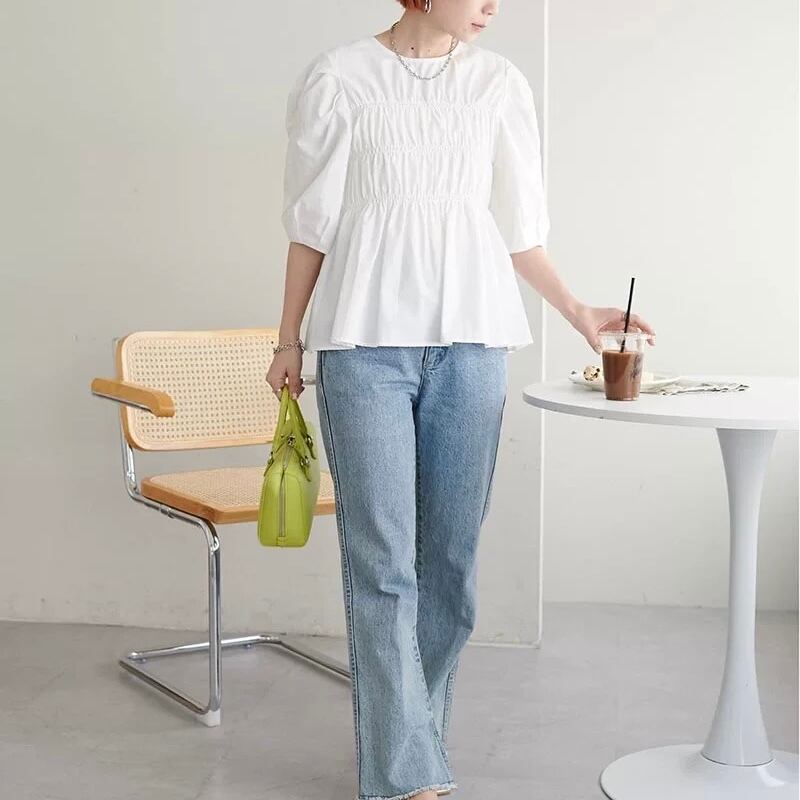 TS-0269 ギャザー カジュアル フレア 半袖 トップス レディース カジュアル シンプル 可愛い お洒落 きれいめ 大人