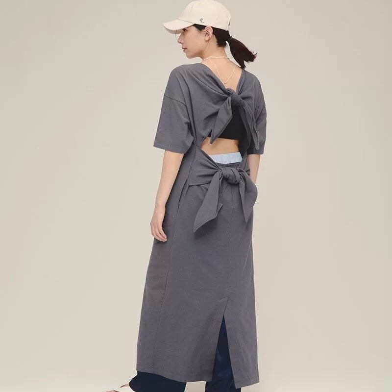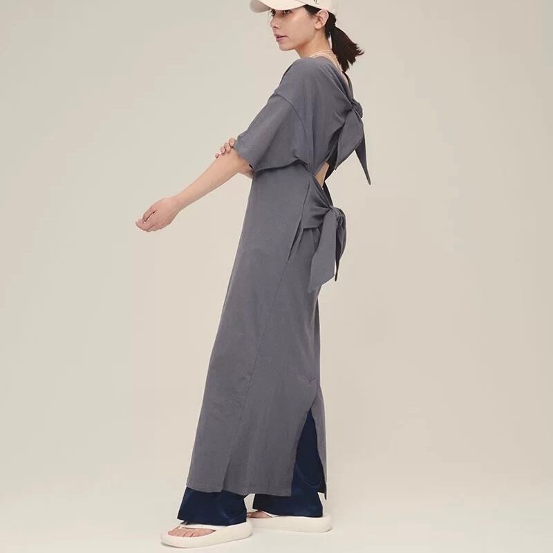 OP-0204 リボン バックオープン 半袖 スリット ロング丈 ワンピース レディース カジュアル シンプル 可愛い お洒落 きれいめ 大人