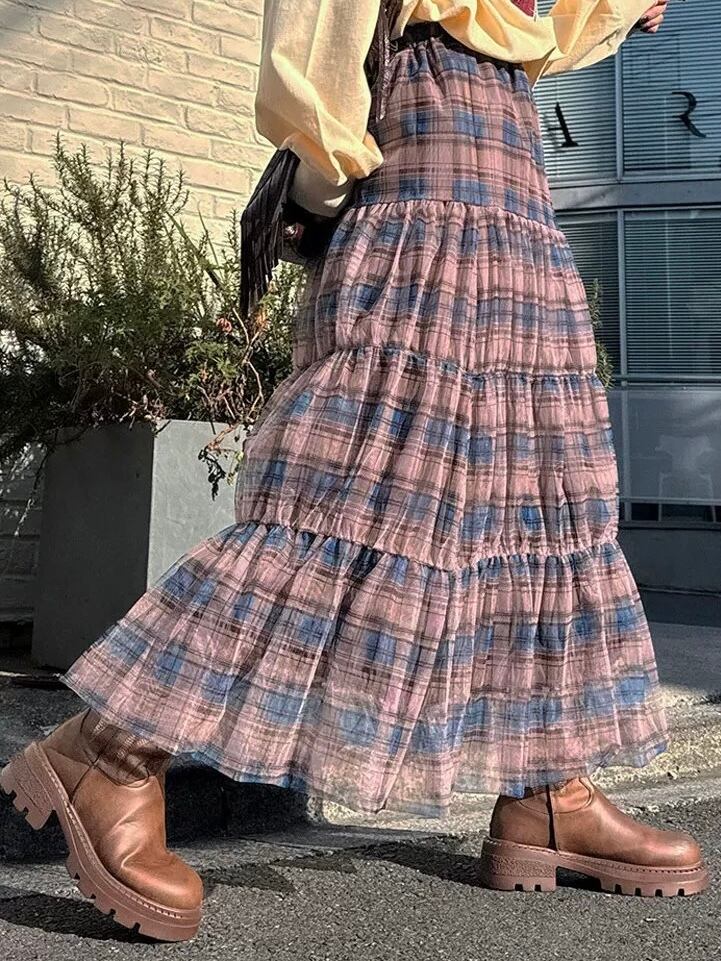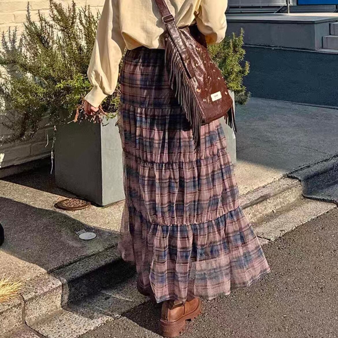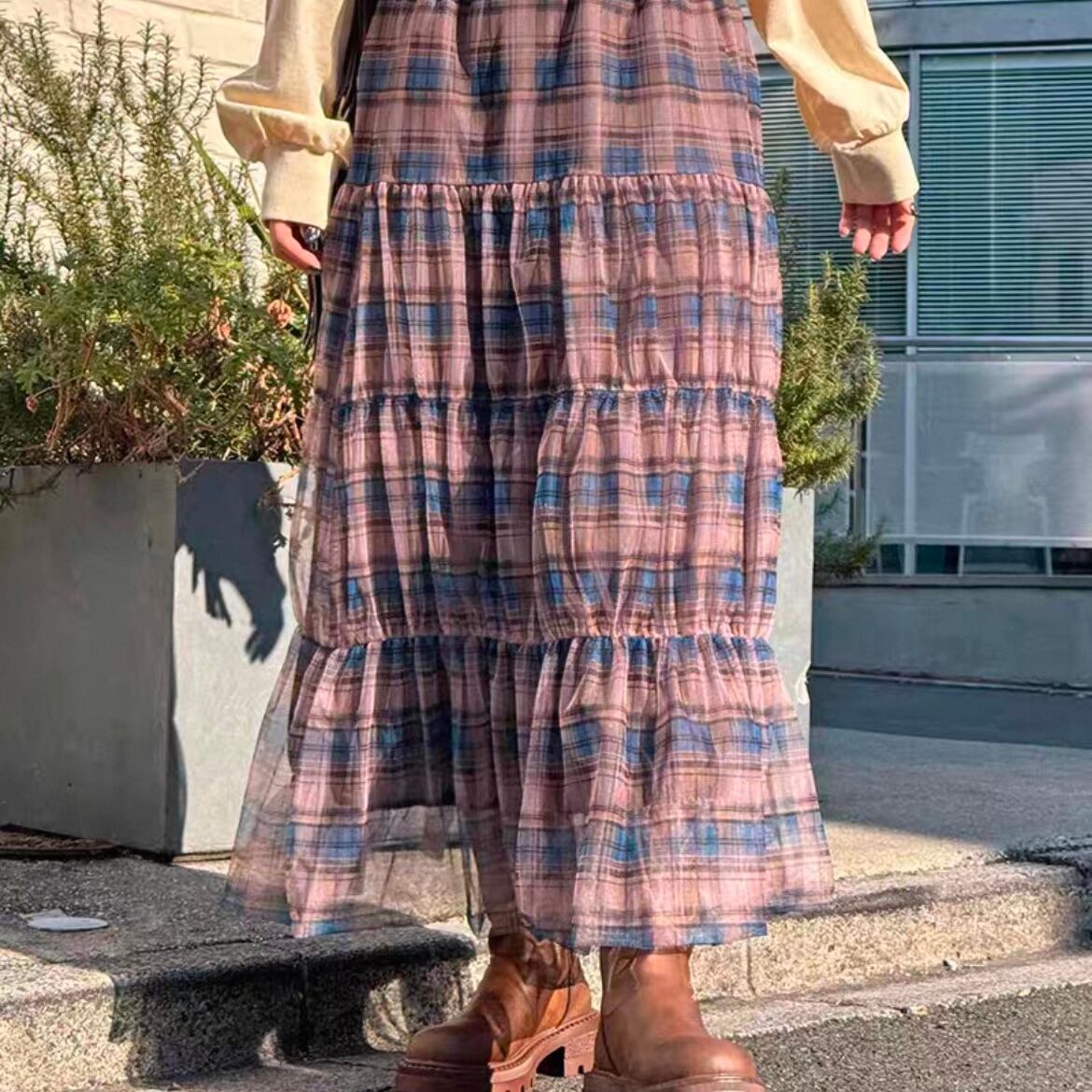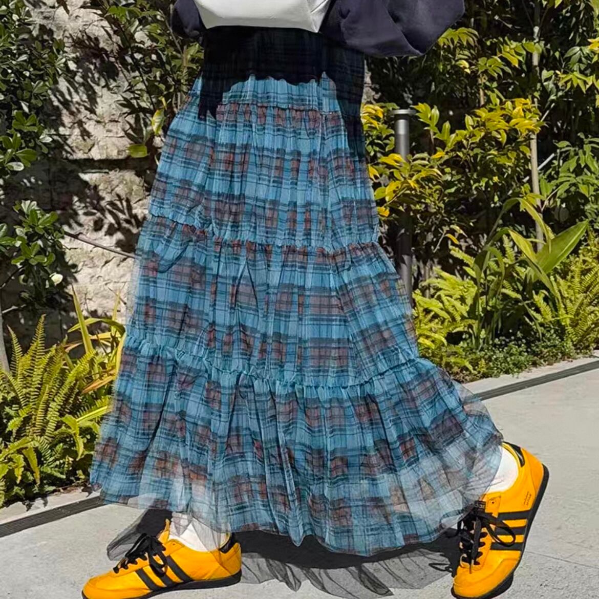 SK-0070 チェック チュール スカート ロング丈 ワンピース レディース カジュアル シンプル 可愛い お洒落 きれいめ 大人