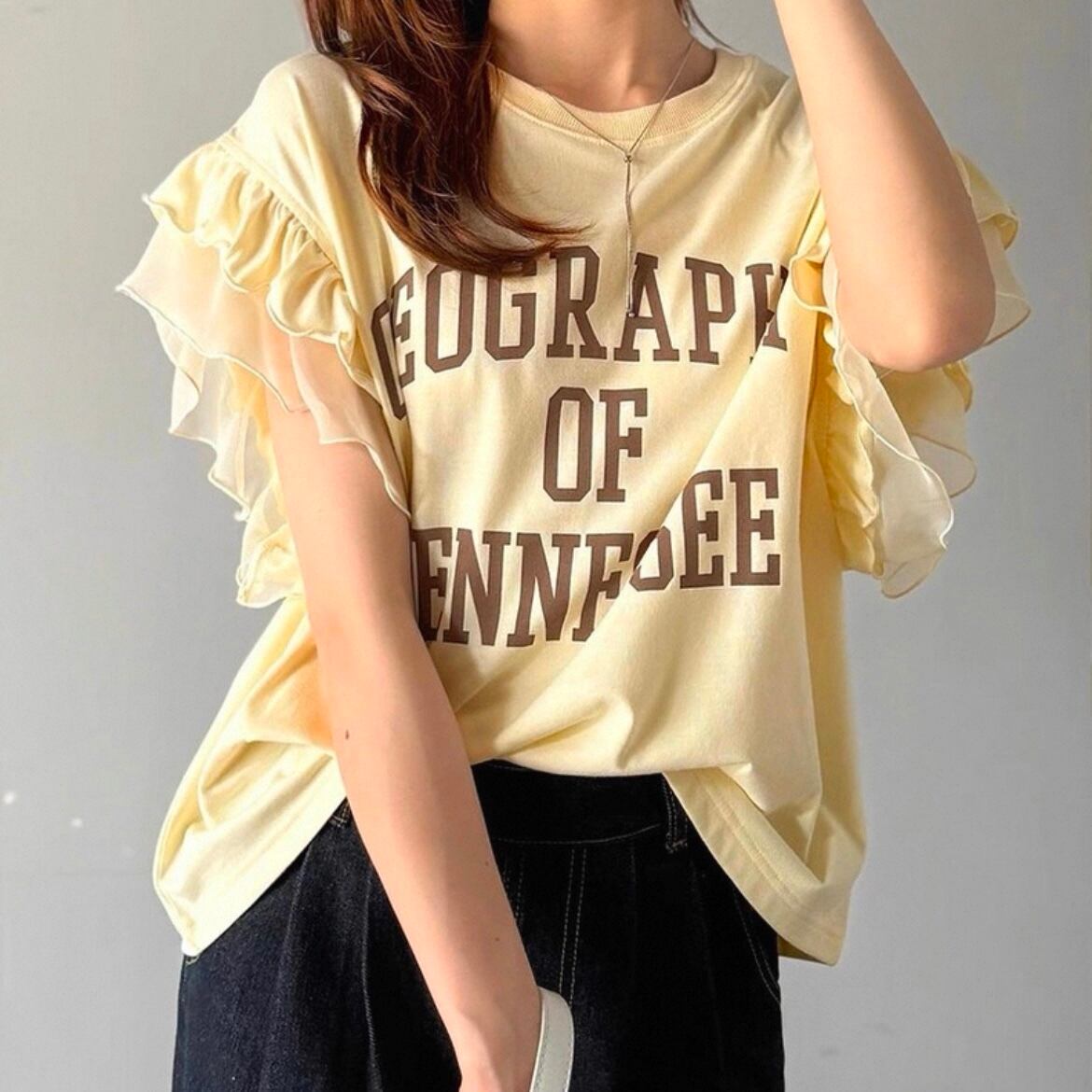 TS-0304 フリル袖 カレッジロゴ ロマンティック レタリング Tシャツ 半袖 カジュアル トップス レディース カジュアル シンプル 可愛い お洒落 きれいめ 大人