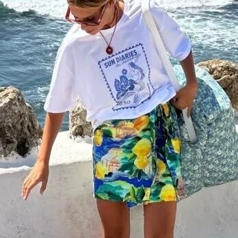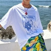 TS-0334 夏 ハイビスカス 切手 プリント 半袖 Tシャツ トップス レディース カジュアル シンプル 可愛い お洒落 きれいめ 大人