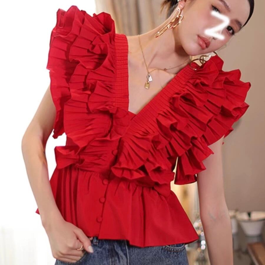 TS-0336 Vネック フリル レッド ガーリー トップス レディース カジュアル シンプル 可愛い お洒落 きれいめ 大人