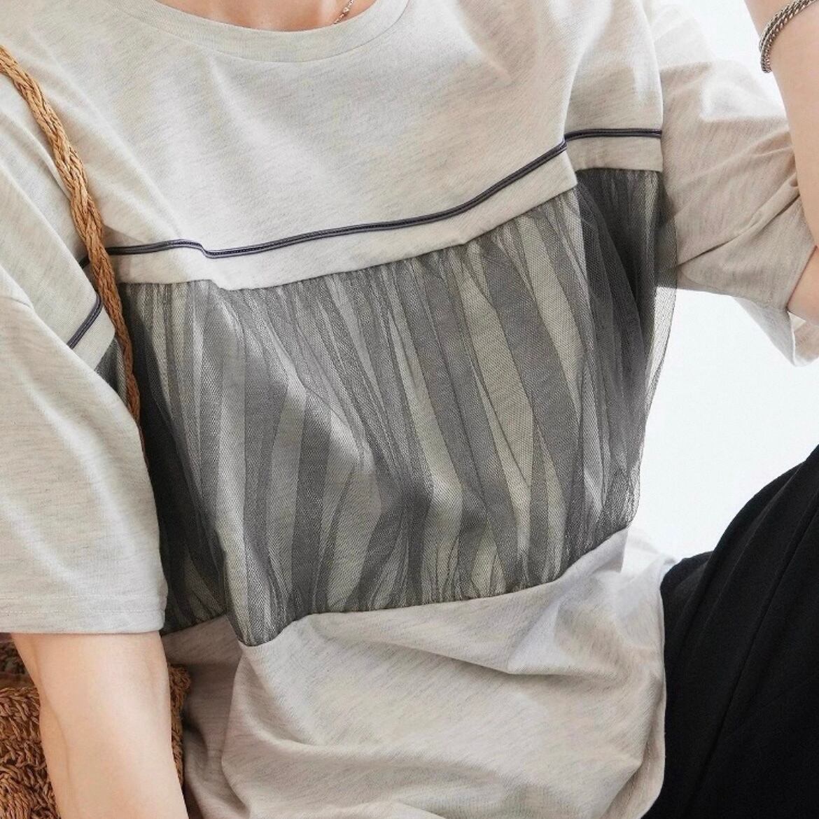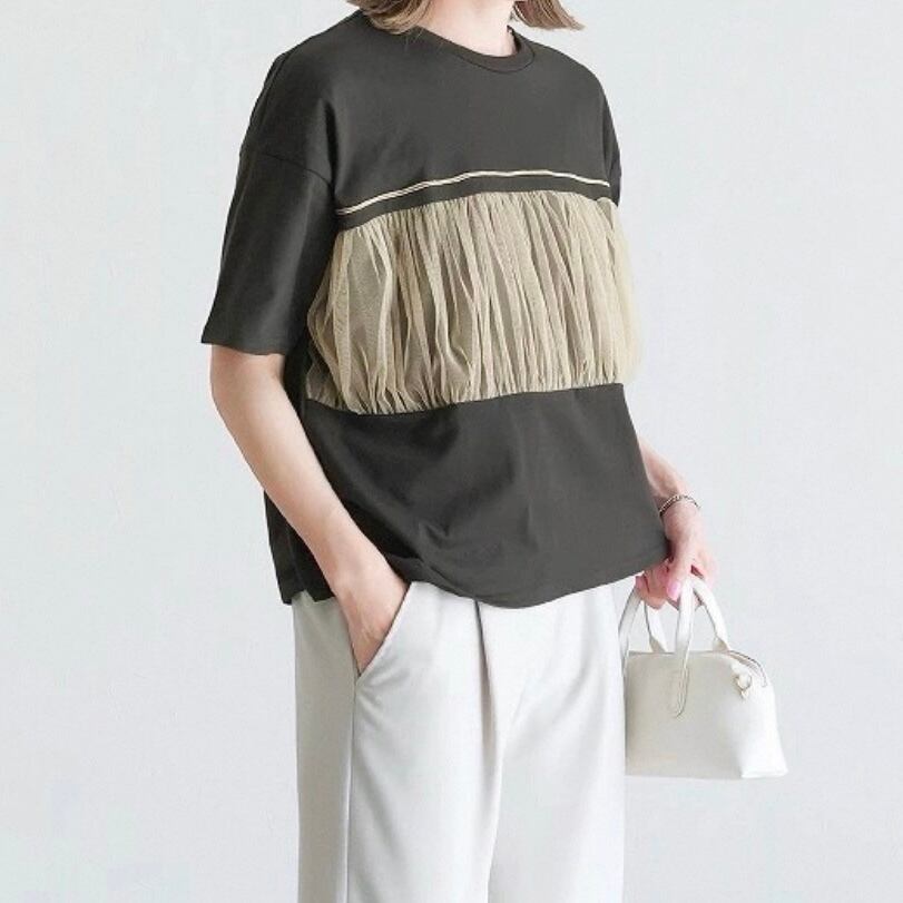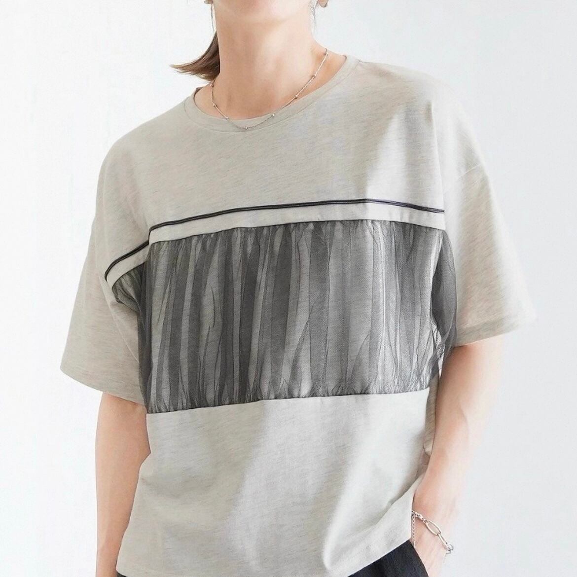 TS-0346 バイカラー チュールポイント Tシャツ トップス レディース カジュアル シンプル 可愛い お洒落 きれいめ 大人