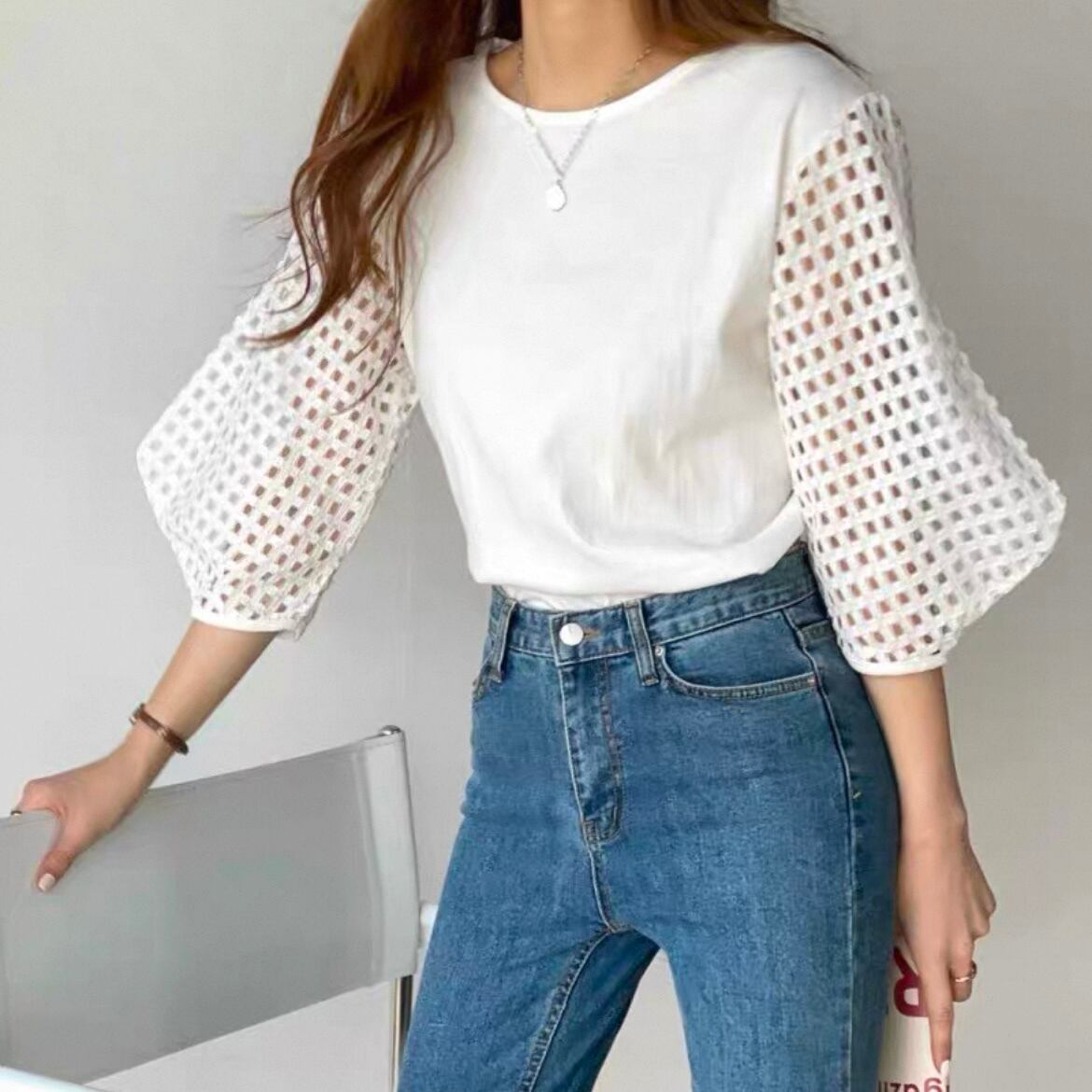 TS-0369 メッシュ袖 長袖 無地 トップス レディース カジュアル シンプル 可愛い お洒落 きれいめ 大人