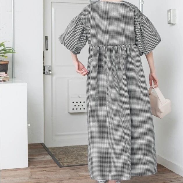 OP-0235 ギンガムチェック 5分丈 Vネック ロング丈 ワンピース レディース カジュアル シンプル 可愛い お洒落 きれいめ 大人