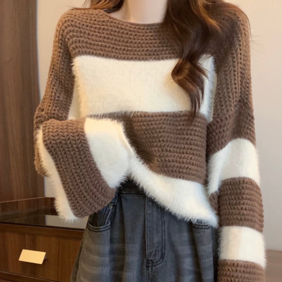 NT-0375 オーバーフィット ボーダー ストライプ シャギー ニット ゆったり トップス 長袖 レディース カジュアル シンプル 可愛い お洒落 きれいめ 大人