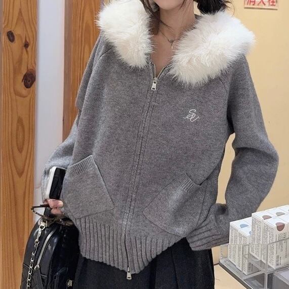 NT-0385 フェイクファー付き ジッパー ニット ゆったり トップス 長袖 レディース カジュアル シンプル 可愛い お洒落 きれいめ 大人