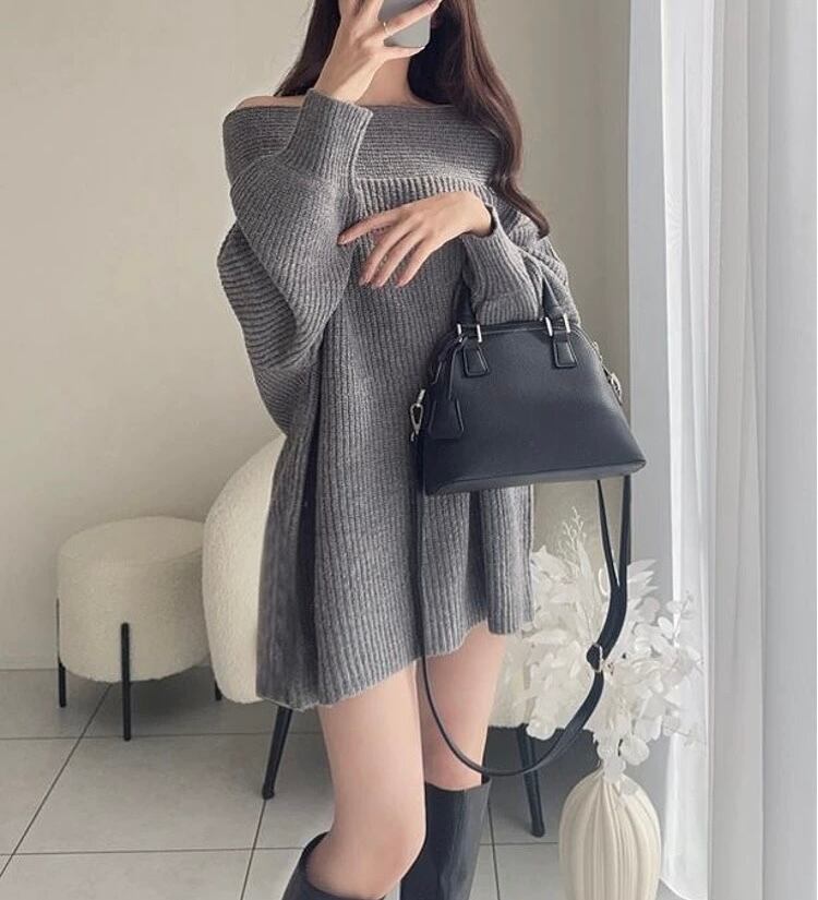 NT-0387 2WAY オフショルダー フリル ニット ワンピース ゆったり トップス 長袖 レディース カジュアル シンプル 可愛い お洒落 きれいめ 大人