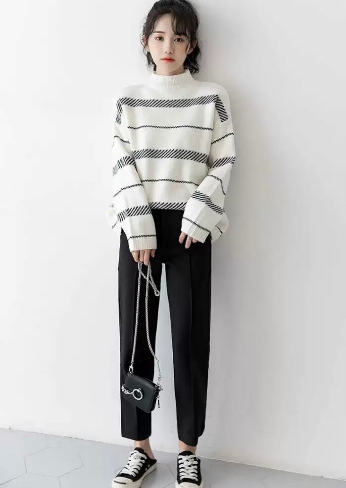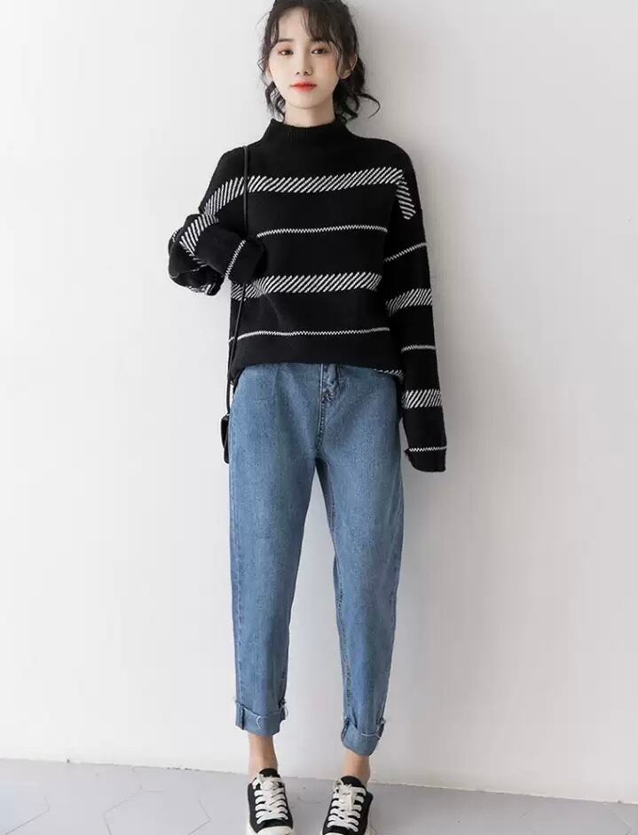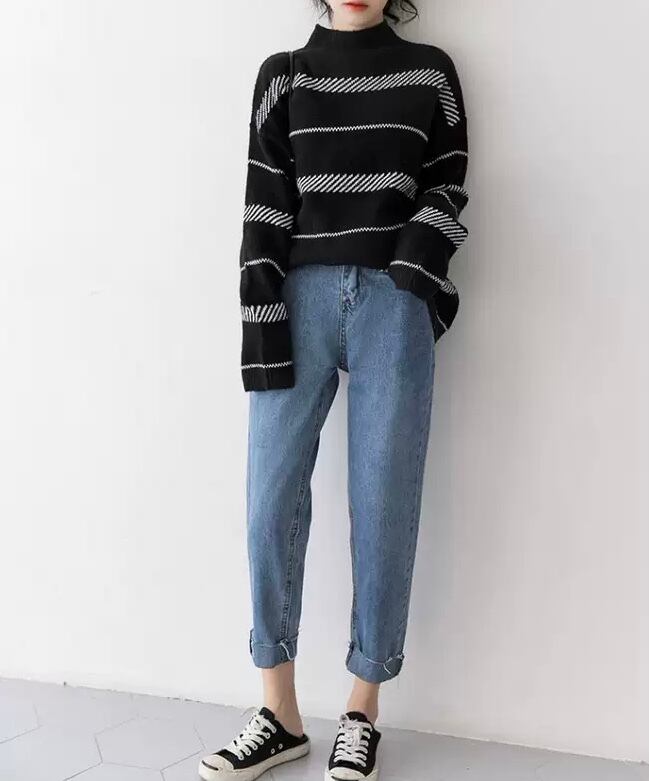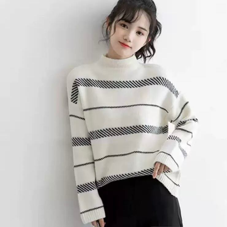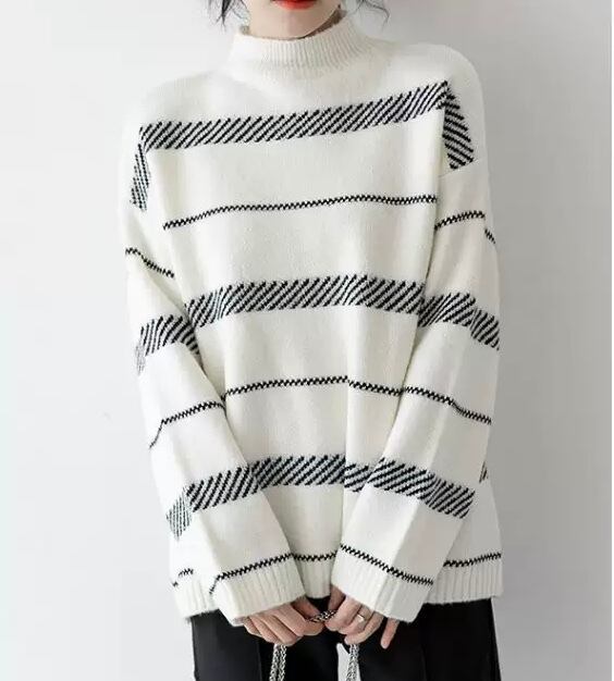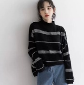 NT-0156 ストライプ セーター ハイネック ニット ウール 秋冬 ルーズ 可愛い カジュアル トップス 長袖 お洒落
