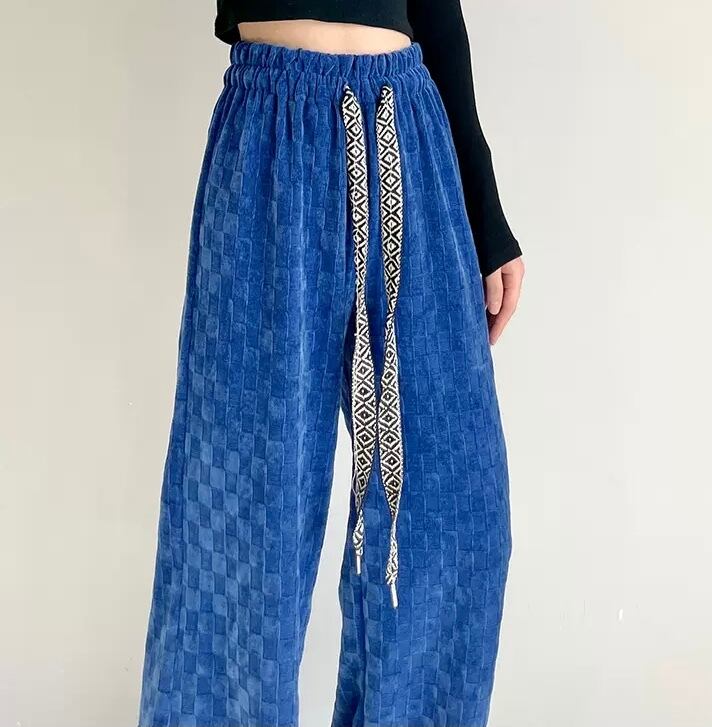 PT-0159 ロング丈 パンツ ブロックチェック ベルベット ニット ワイドレッグ トレンド レディース 可愛い お洒落 カジュアル