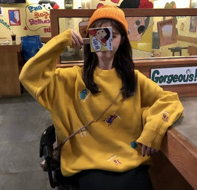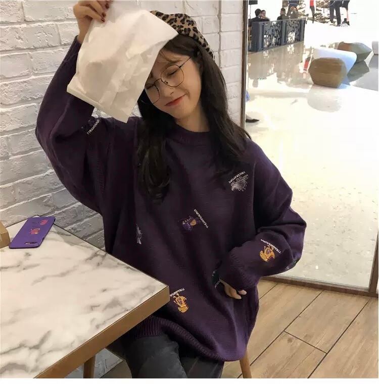 TS-0381 恐竜 刺繡 ラウンドネック ニット セーター 可愛い カジュアル トップス 長袖 お洒落
