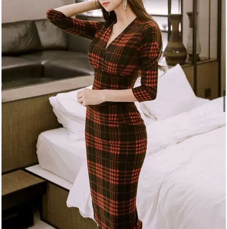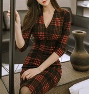 OP-0026 チェック柄 タイトスカート ワンピース 7分丈 Vネック 膝丈 きれいめ 可愛い カジュアル お洒落 秋冬