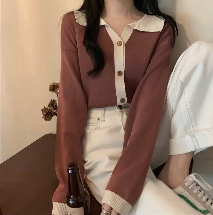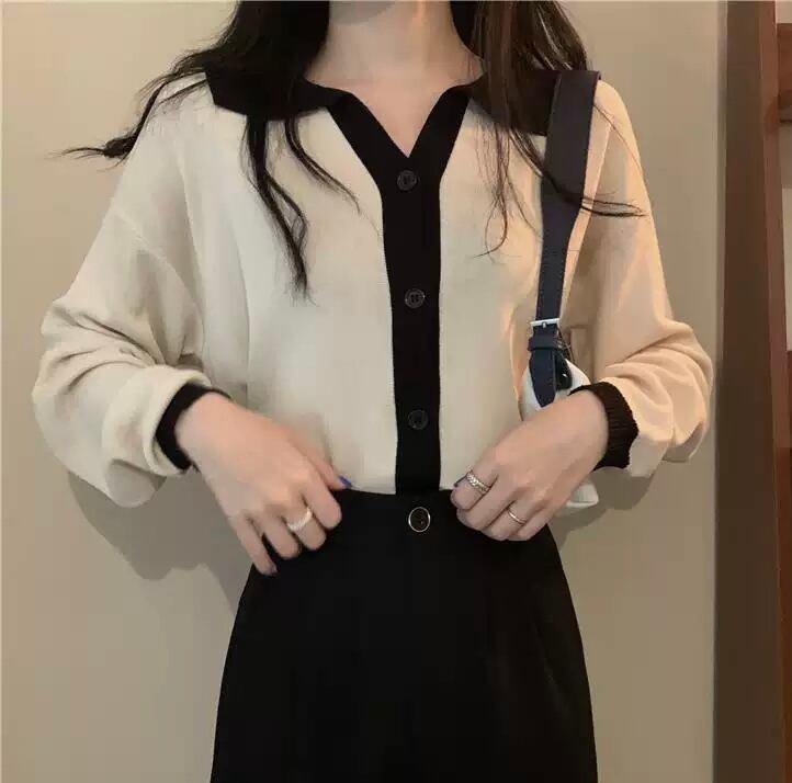 NT-0170 襟付き バイカラー カーディガン カラー ニット 秋冬 可愛い カジュアル トップス 長袖 お洒落