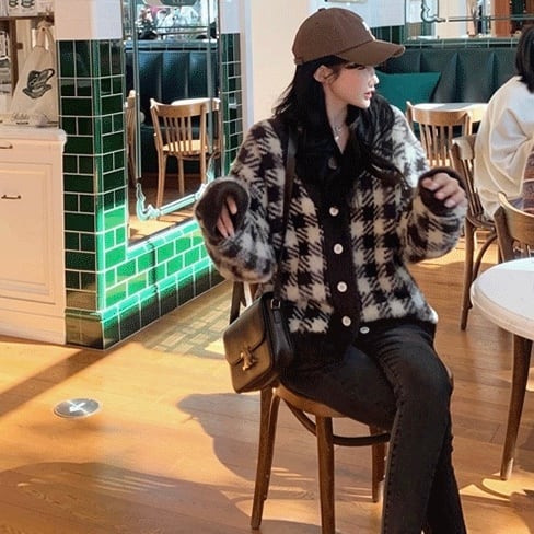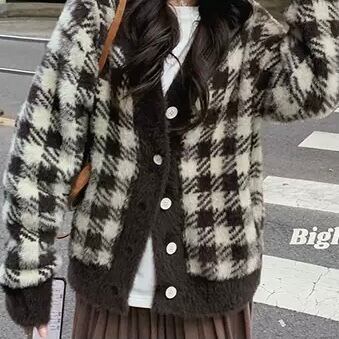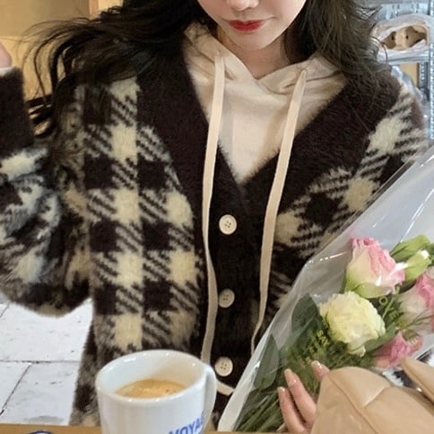 NT-0186 チェック柄 ニット カーディガン レトロ セーター ウール ふわふわ レディース 可愛い カジュアル トップス 長袖 お洒落