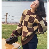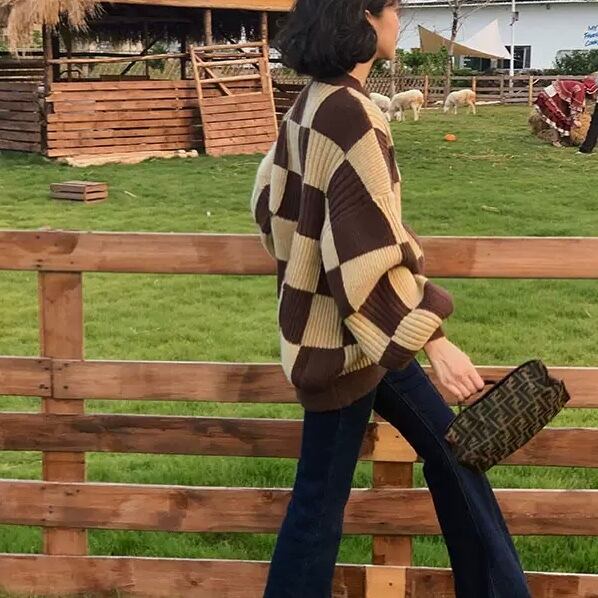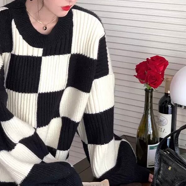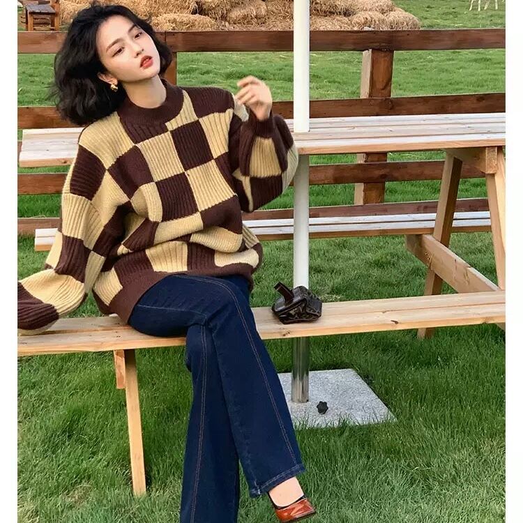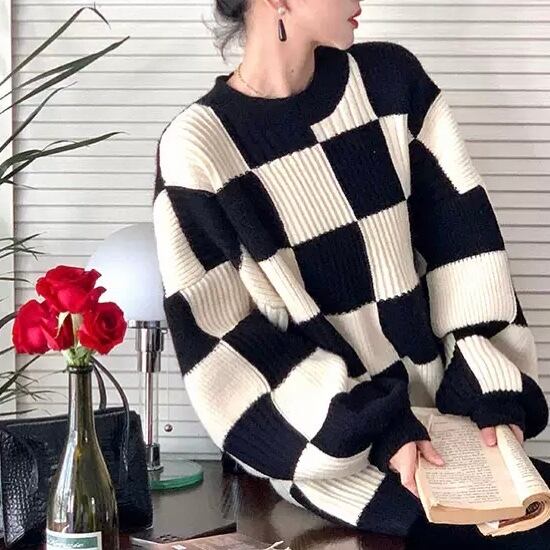 NT-0187 市松模様 ランタンスリーブ ラウンドネック ニット レトロ セーター レディース 可愛い カジュアル トップス 長袖 お洒落