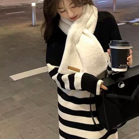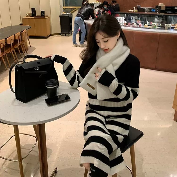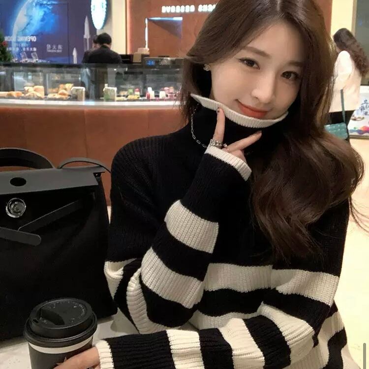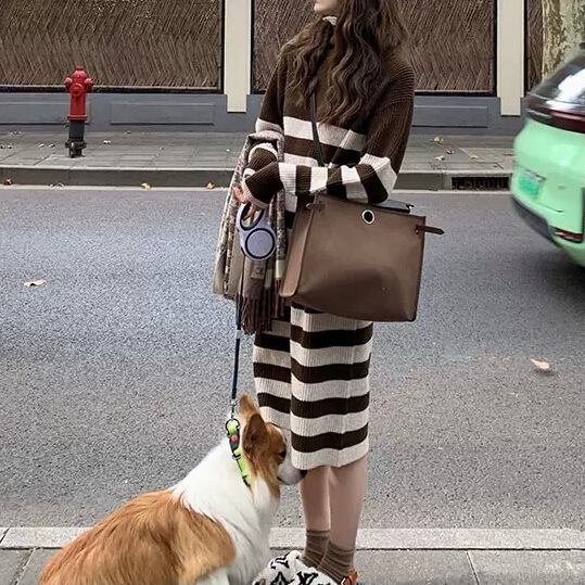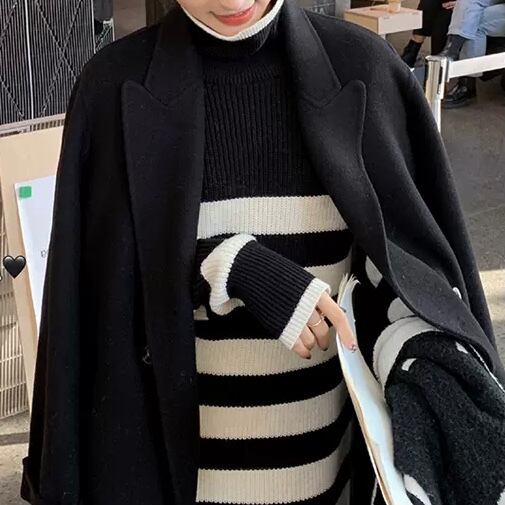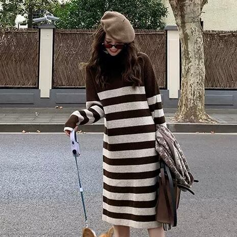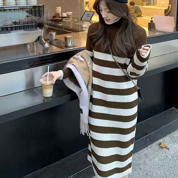 OP-0033 ハイネック ストライプ ニット 膝丈 レトロ ワンピース オールインワン きれいめ 可愛い カジュアル お洒落