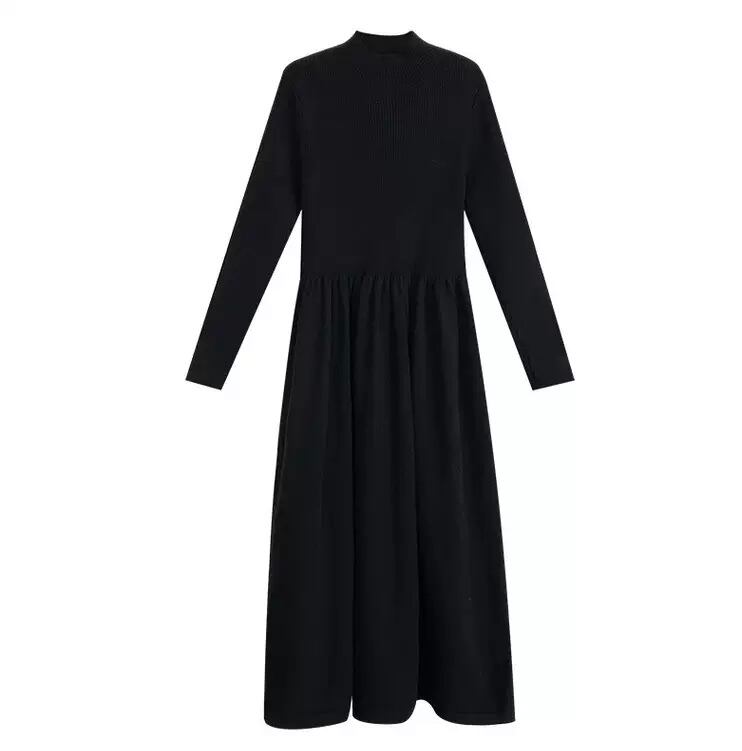 OP-0034 ハイネック 無地 ニット ロング丈 レトロ ワンピース オールインワン きれいめ 可愛い カジュアル お洒落