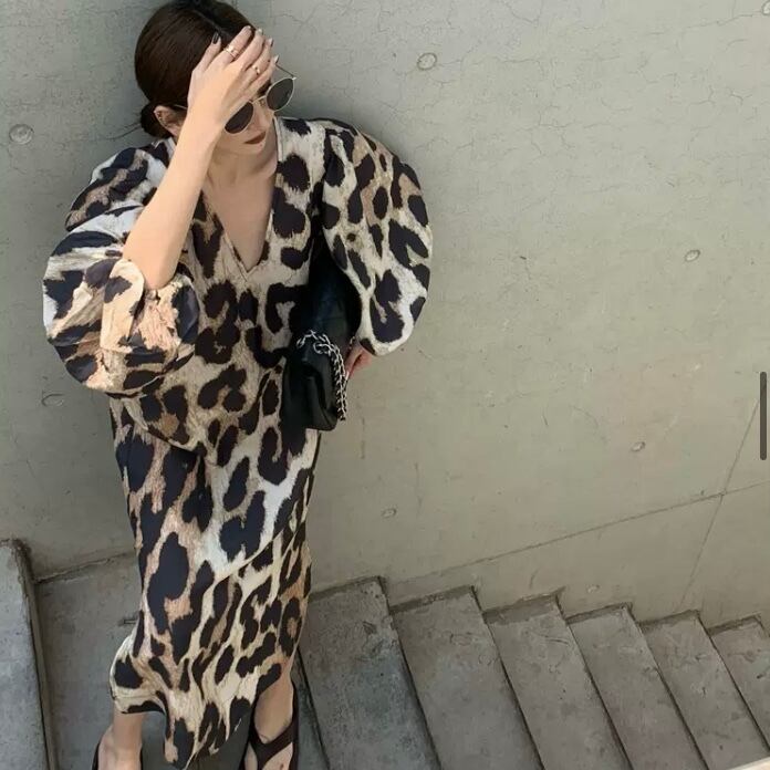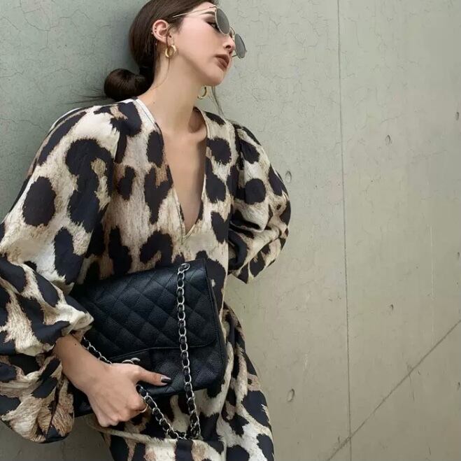 OP-0035 Vネック ドレス ストリート ヒョウ柄 ロング丈 ワンピース オールインワン きれいめ 可愛い カジュアル お洒落