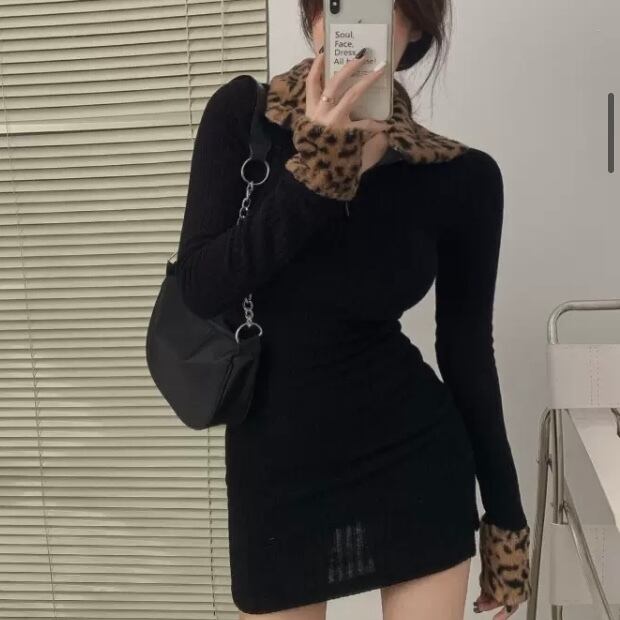 OP-0036 ヒョウ柄 襟付き ファー ヒョウ柄 ミニ丈 ワンピース オールインワン きれいめ 可愛い カジュアル お洒落