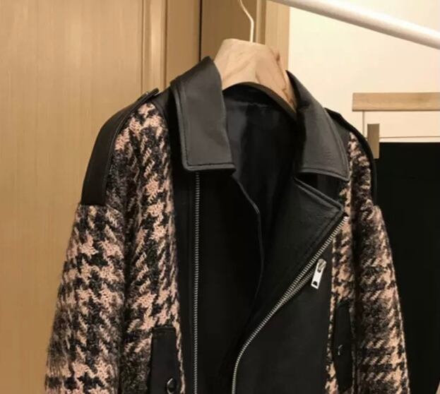 JK-0154 レザー ジャケット パッチワーク チェック柄 クール レディース 大人 可愛い カジュアル 長袖 お洒落