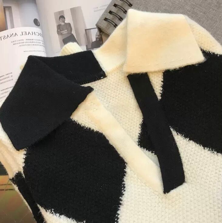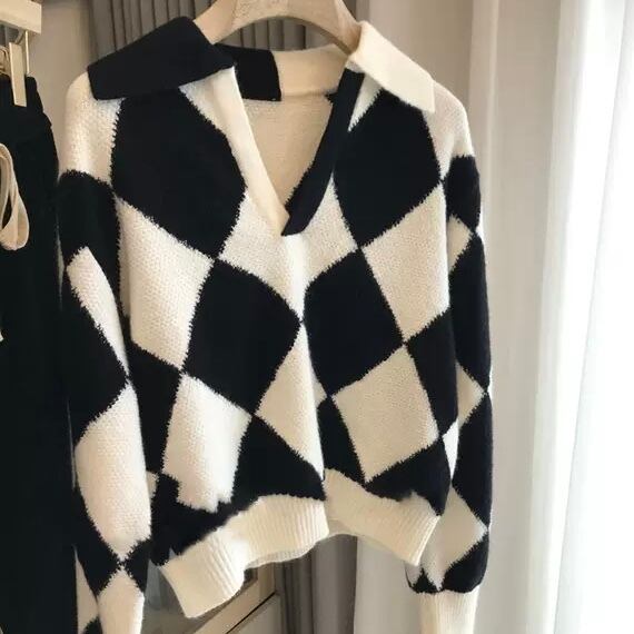 NT-0194 ダイヤモンド チェッカーボード ウール コントラストカラー 柄 Vネック ルーズ ニット 可愛い カジュアル トップス 長袖 お洒落