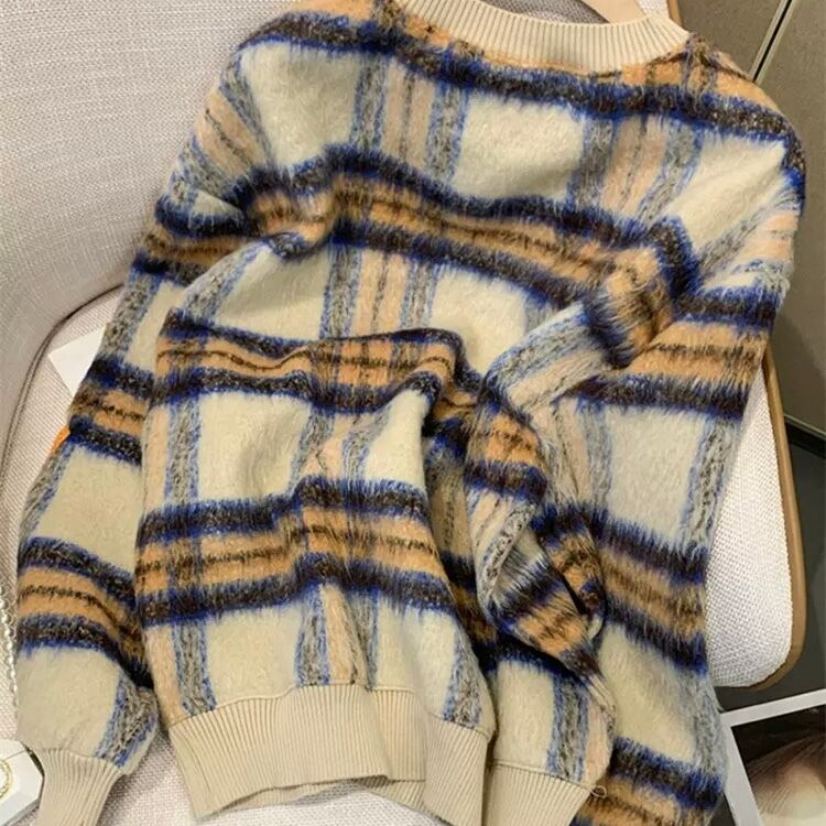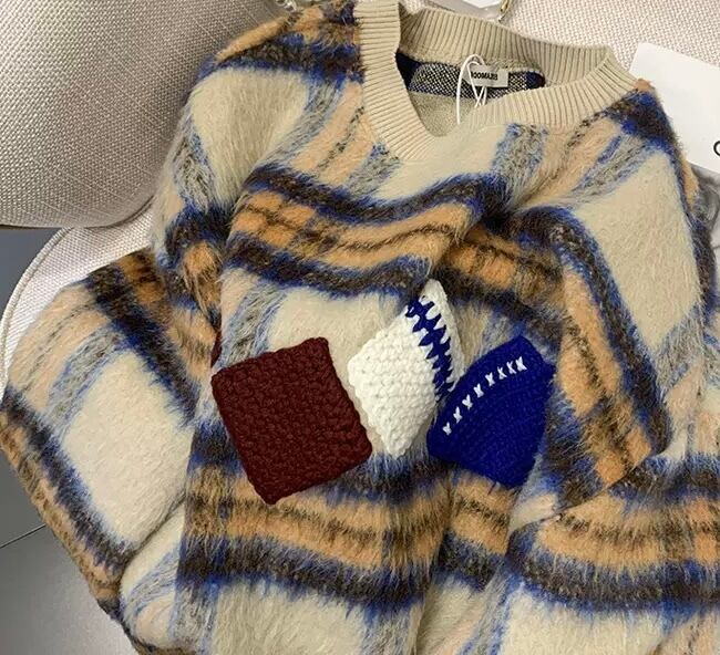 NT-0205 チェック柄 パッチワーク風 刺繍 セーター ニット 可愛い カジュアル トップス 長袖 お洒落