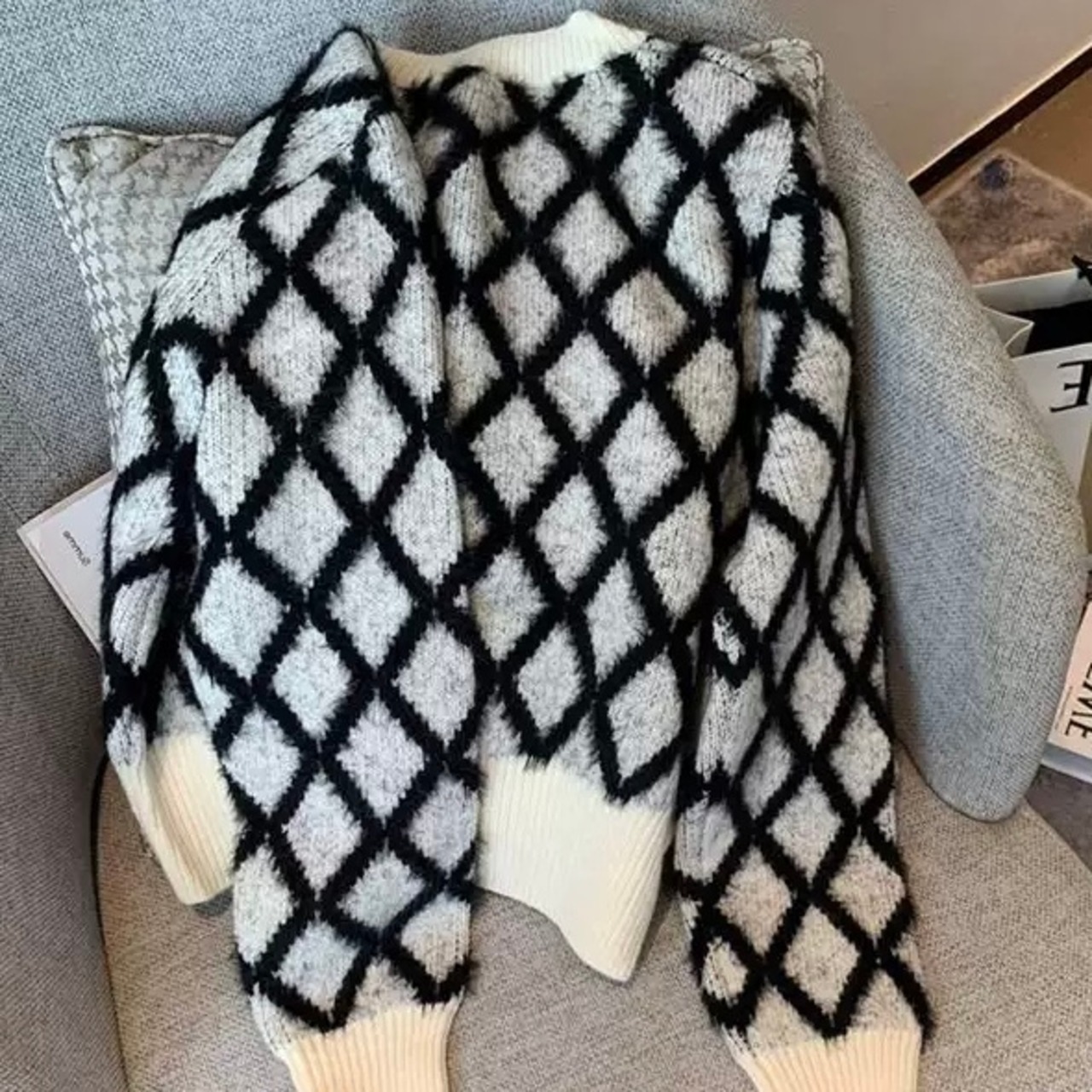 NT-0208 ダイヤモンドチェック柄 リボン カーディガン セーター ニット 可愛い カジュアル トップス 長袖 お洒落