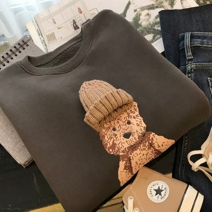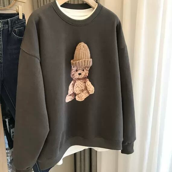 TS-0395 くま キャラ トレーナー 裏起毛 プルオーバー ニット ラウンドネック 可愛い カジュアル トップス 長袖 お洒落