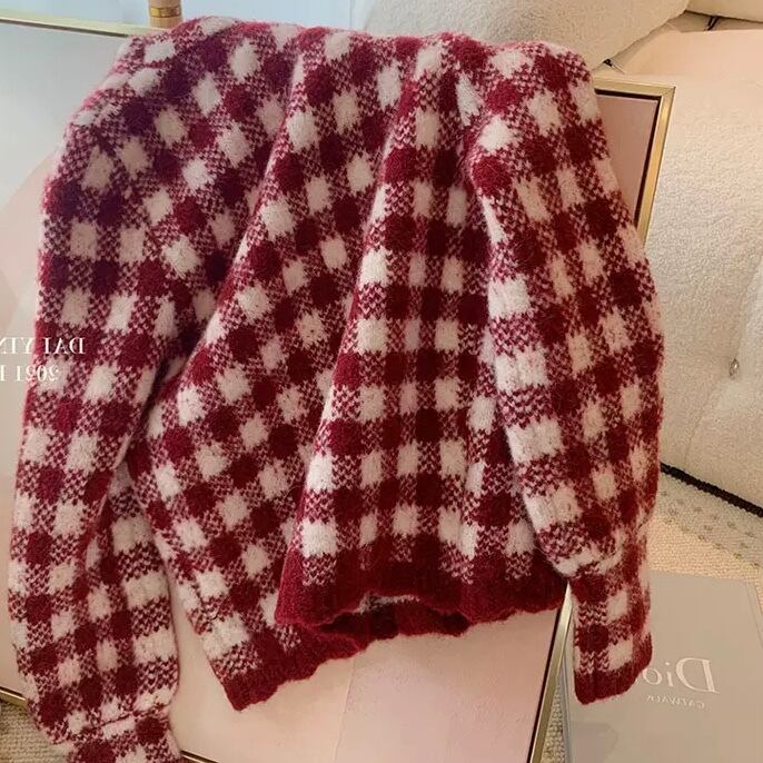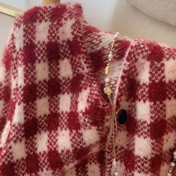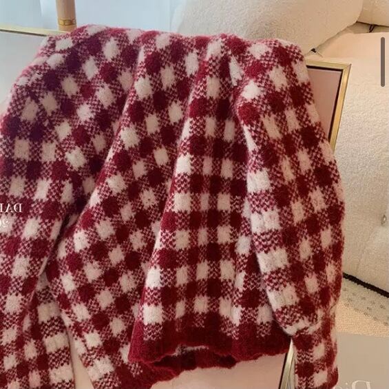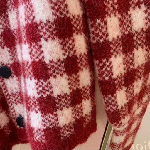 NT-0209 ギンガムチェック レッド カーディガン セーター ニット 可愛い カジュアル トップス 長袖 お洒落