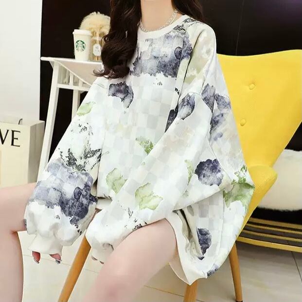 TS-0406 フルプリント ブロックチェック 絞り染め ルーズ ラージサイズ トレーナー トップス レディース シンプル 可愛い カジュアル 長袖 お洒落