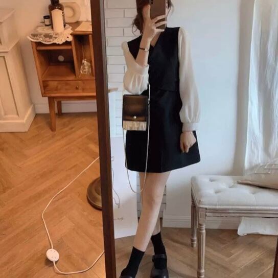 長袖ブラウスとショート丈ワンピースが