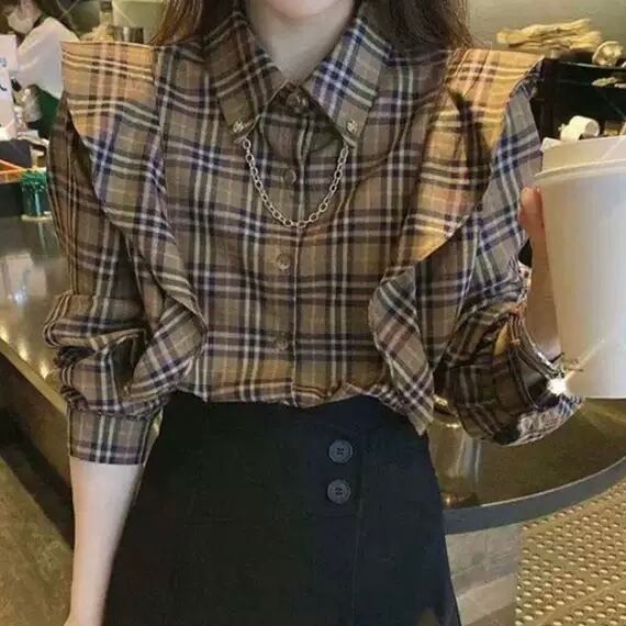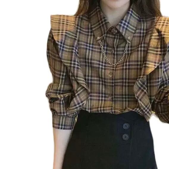 BL-0194 レトロ フリル チェック柄 ナチュラル シャツ トップス レディース シンプル 可愛い カジュアル 長袖 お洒落