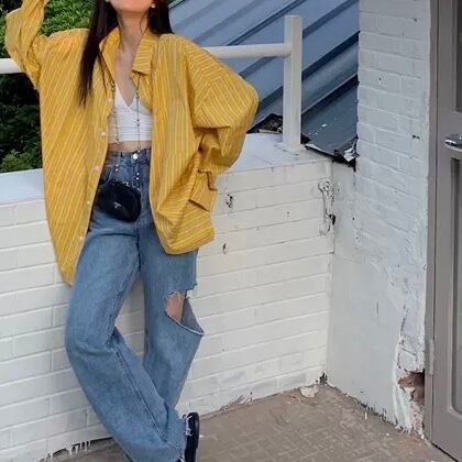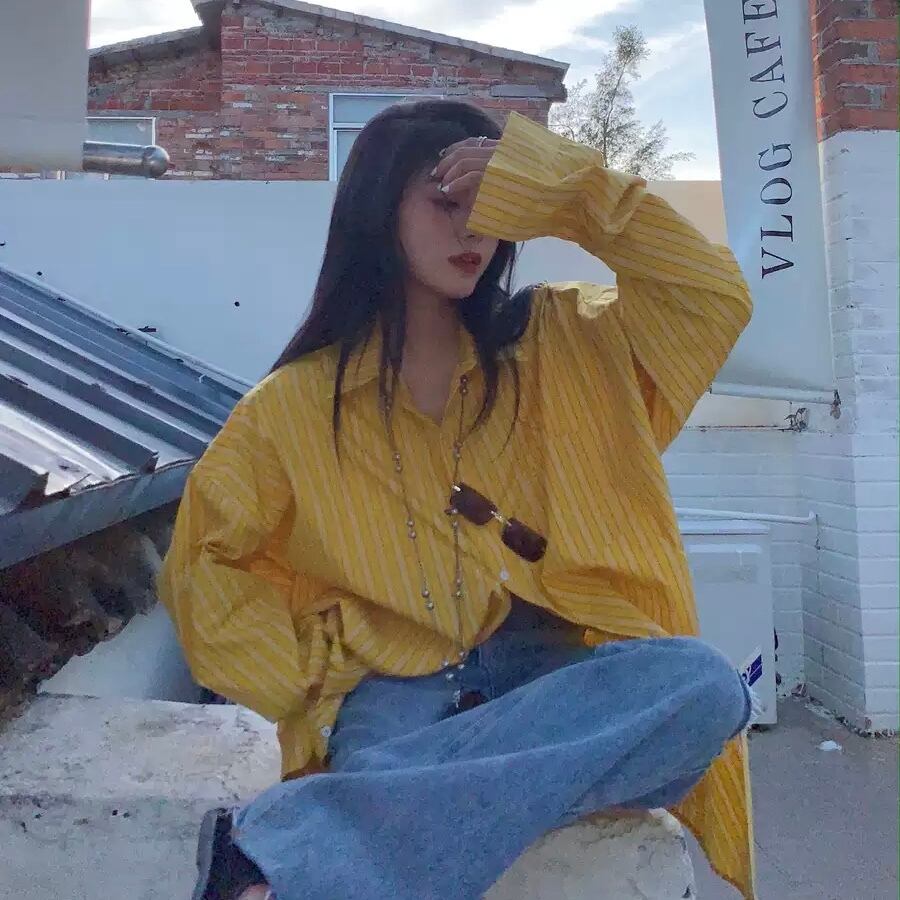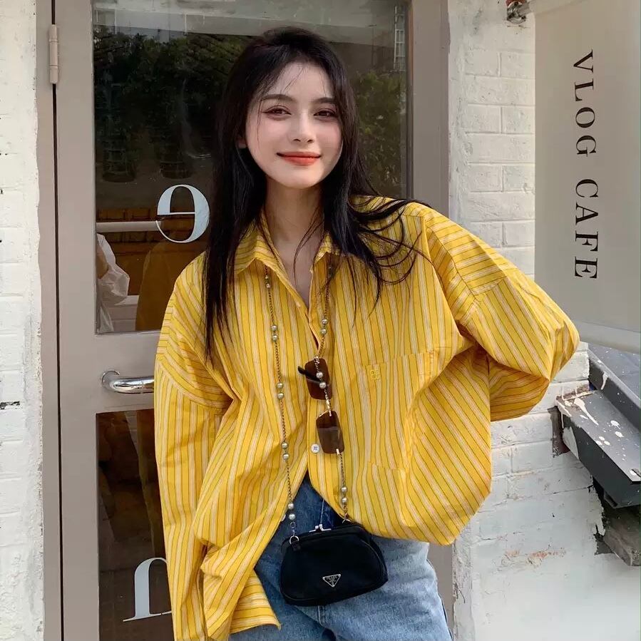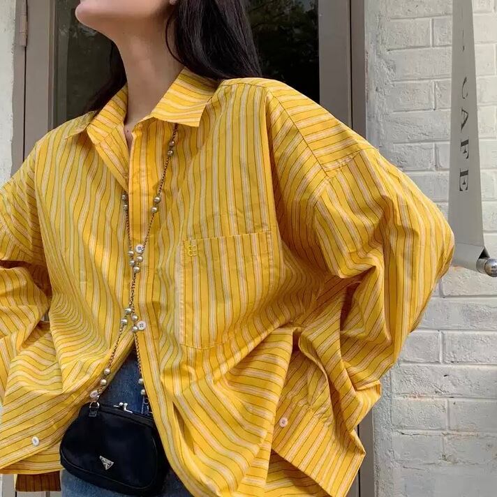 BL-0202 ストライプ レトロ イエロー シャツ レディース ルーズ 長袖 トップス シンプル 可愛い きれいめ お洒落