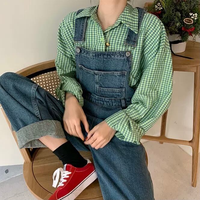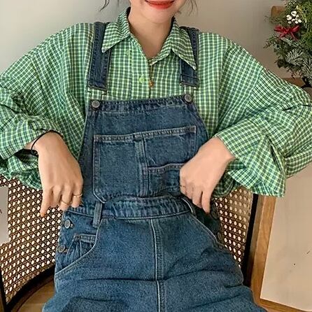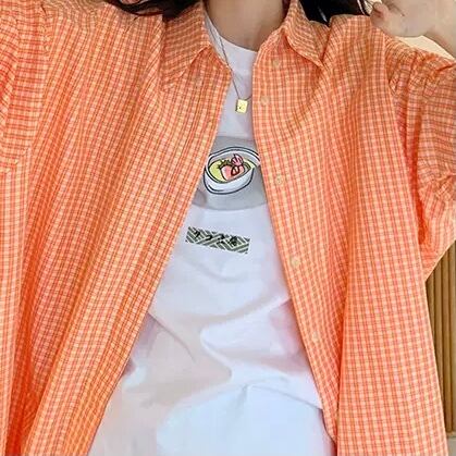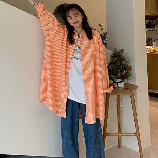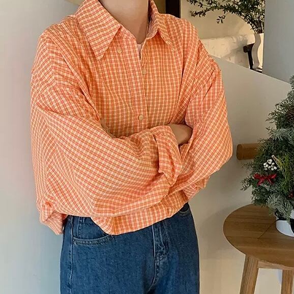 BL-0205 ルーズ オーバーサイズ チェック柄 オレンジ グリーン シャツ レディース 長袖 ルーズ トップス シンプル 可愛い カジュアル お洒落