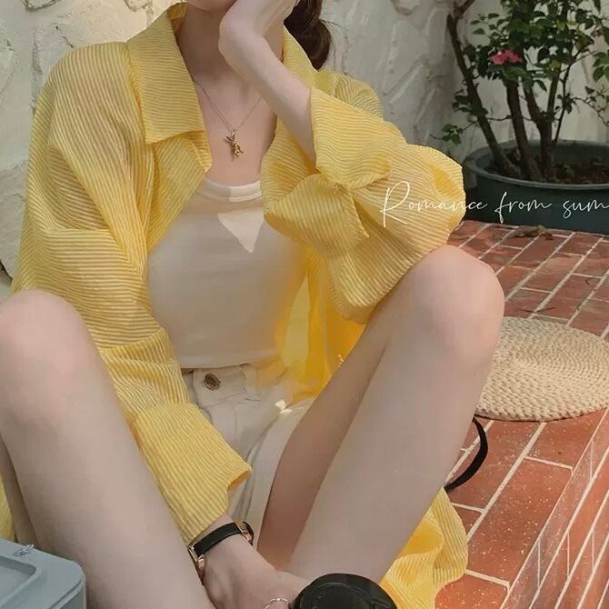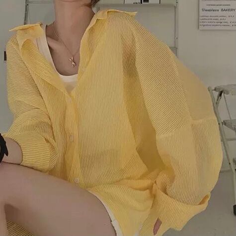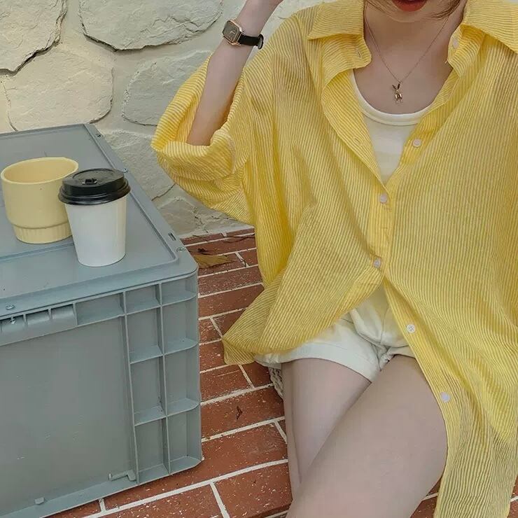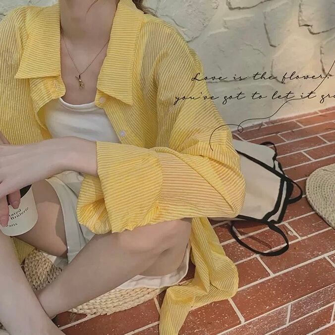 BL-0215 イエロー ストライプ シースルー シャツ カジュアル レディース 長袖 トップス シンプル 可愛い カジュアル お洒落