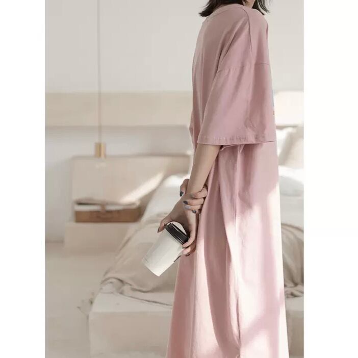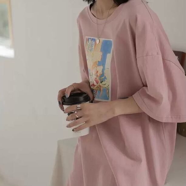 OP-0048 レトロ 油絵イラスト ラウンドネック 膝丈 ワンピース 半袖 シンプル きれいめ 可愛い カジュアル お洒落