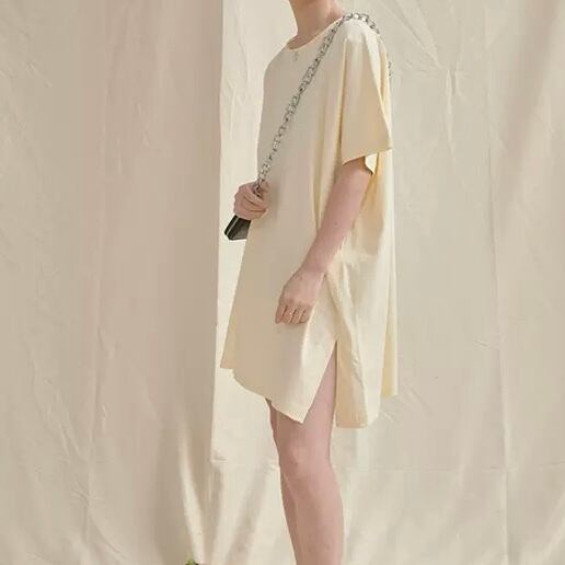 TS-0434 スリット 長め丈 無地 半袖 Tシャツ レディース トップス シンプル 可愛い カジュアル お洒落