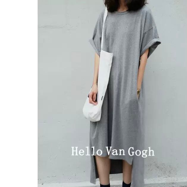 OP-0050 ルーズ 半袖 ワンピース バックロング 無地 ラウンドネック 膝下丈 シンプル きれいめ 可愛い カジュアル お洒落