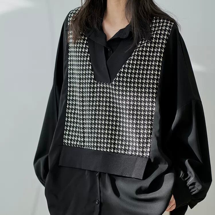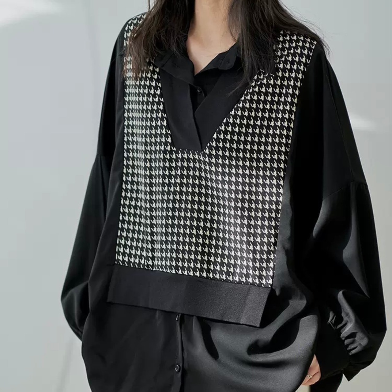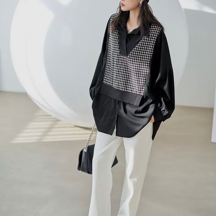 BL-0227 チェック柄 ステッチ ニット 長袖 シャツ フェイクツーピース カジュアル レディース トップス シンプル 可愛い カジュアル お洒落