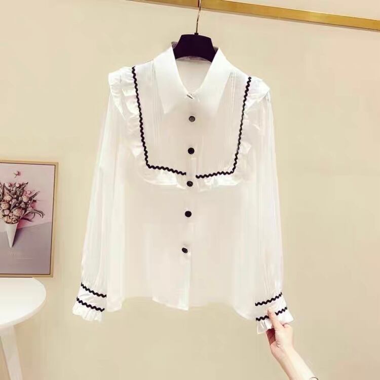 BL-0231 フレンチガーリー ステッチ フリル 上品 長袖 シャツ レディース トップス シンプル 可愛い カジュアル お洒落