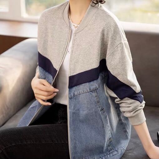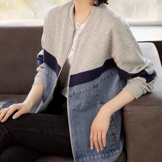 JK-0164 バイカラー デニム ジャケット ルーズ 長袖 レディース トップス シンプル 可愛い カジュアル お洒落