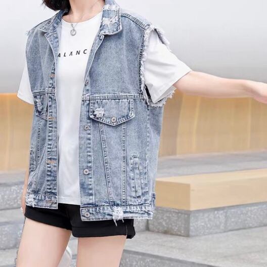 TS-0453 デニムベスト アウター チョッキ ダメージ ビッグプリント トップス シンプル 可愛い カジュアル お洒落