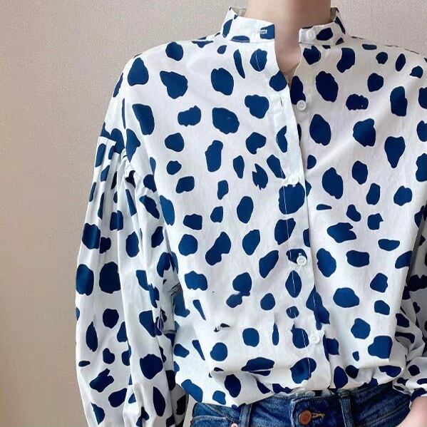 BL-0251 パフスリーブ シャツ 牛柄 水玉 プリント オーバーサイズ ルーズ レディース 長袖 トップス シンプル 可愛い カジュアル お洒落