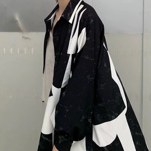 BL-0252 ブラック ホワイト バイカラー 柄 プリント オーバーサイズ シャツ ルーズ クール レディース 長袖 トップス シンプル 可愛い カジュアル お洒落