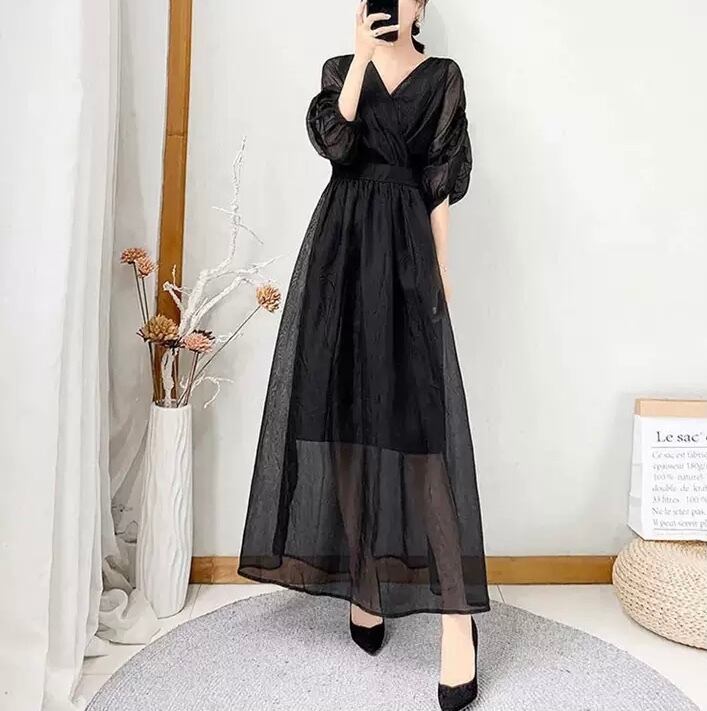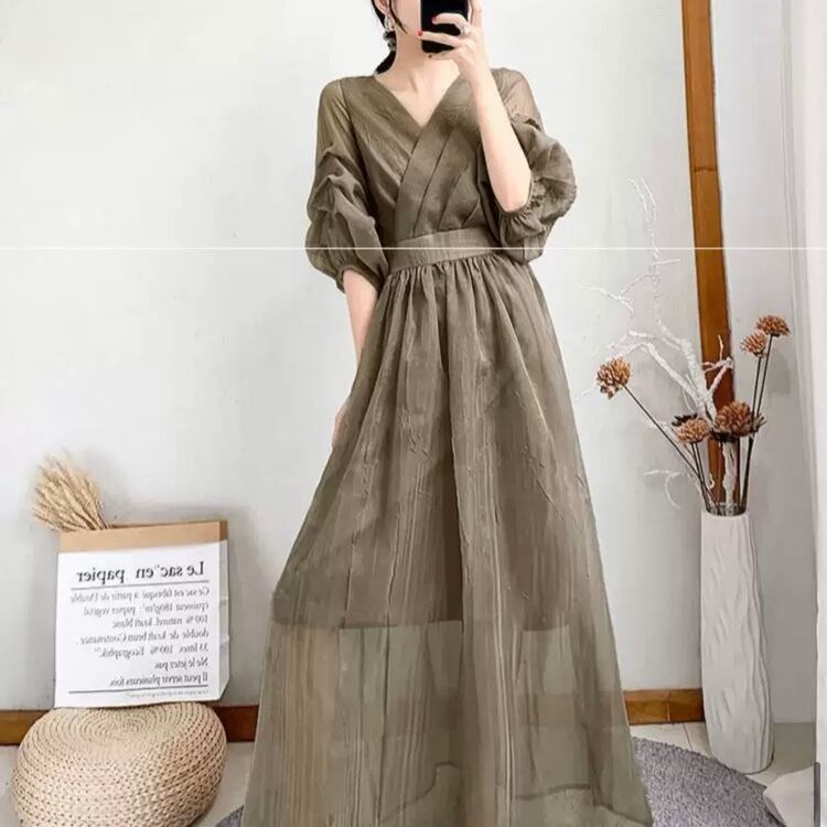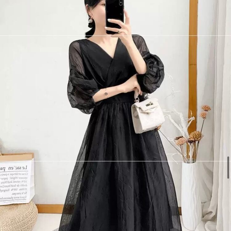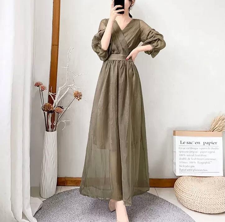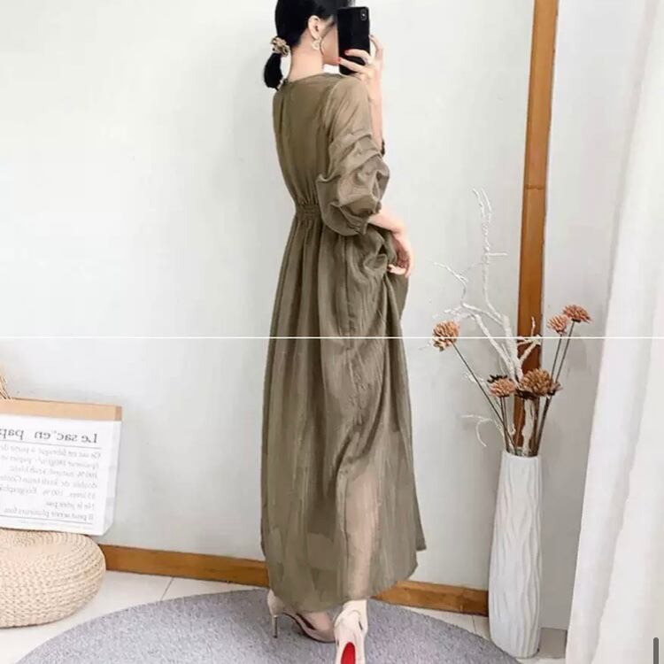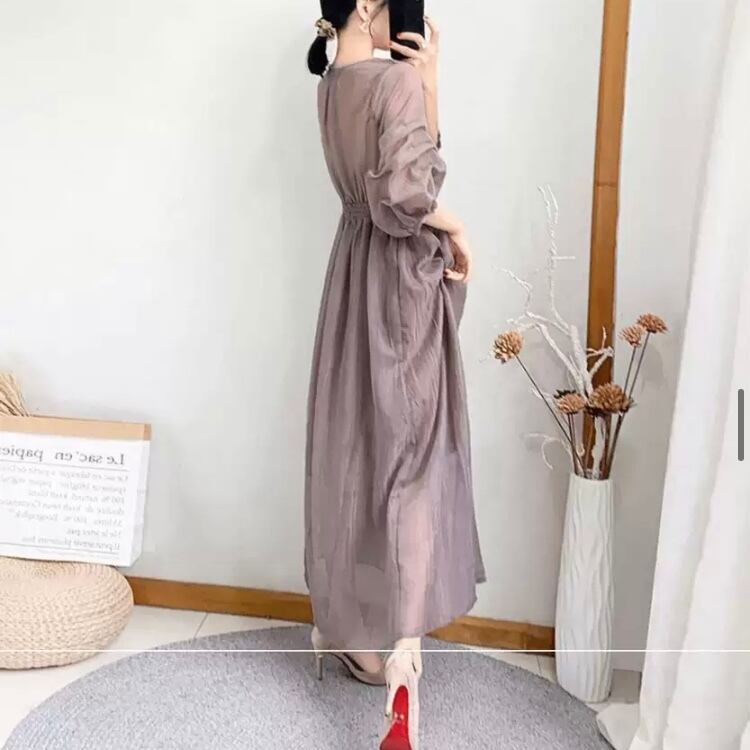 OP-0061 無地 Vネック ワンピース フェアリー ドレス オールインワン レディース ロング丈 シンプル きれいめ 可愛い お洒落 長袖