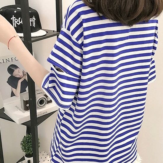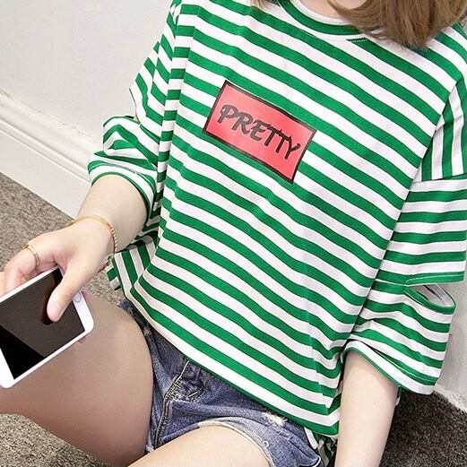 TS-0476 ボーダー カット ラウンドネック 半袖 Tシャツ 英字 レディース トップス シンプル 可愛い カジュアル お洒落