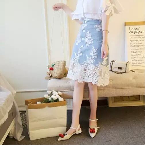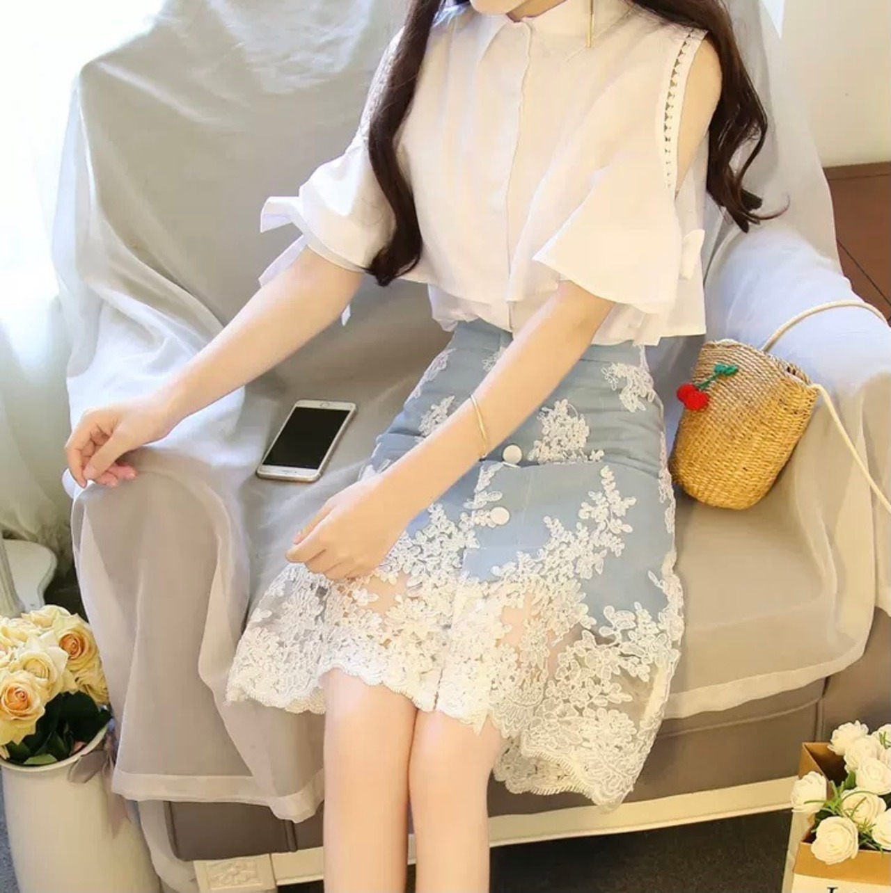 SU-0135 レース スカート 半袖 シャツ 春夏 刺繍 リボン オープンショルダー トップス セットアップ シンプル カジュアル 可愛い お洒落