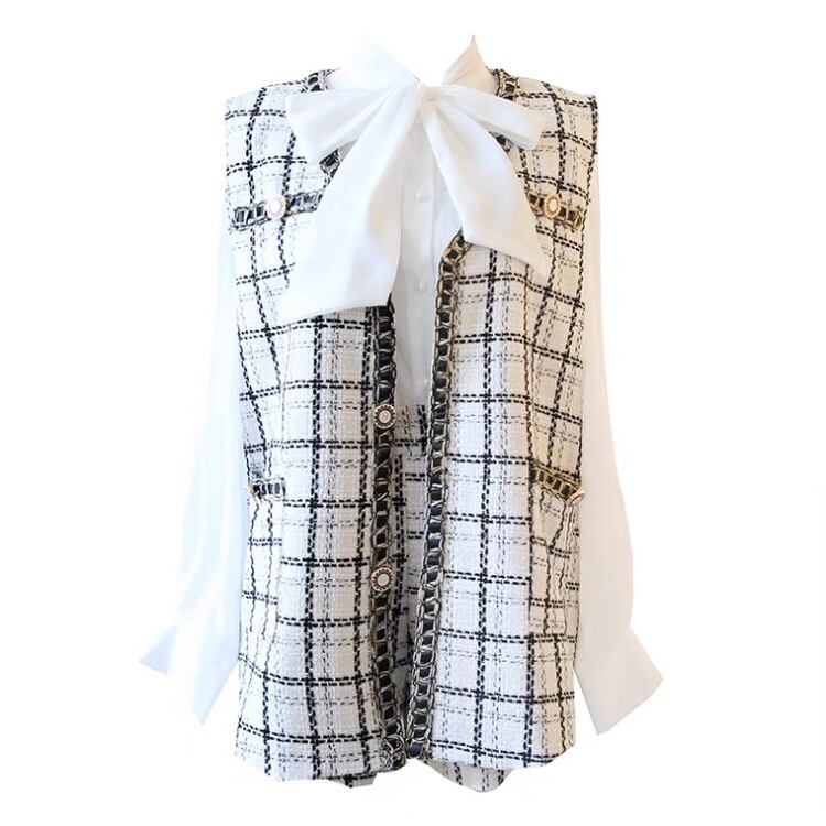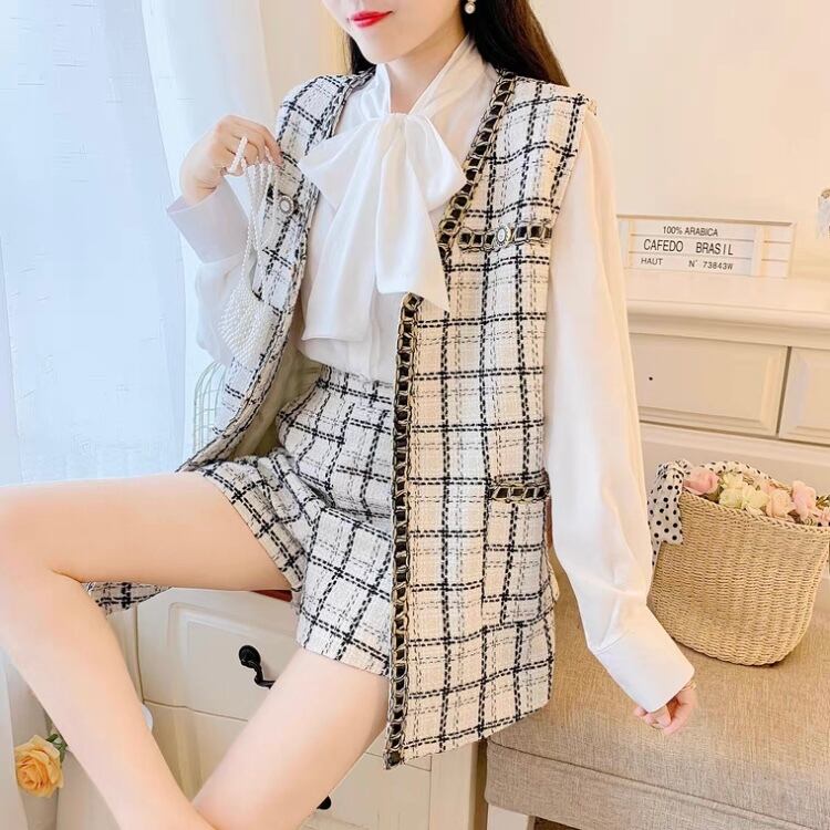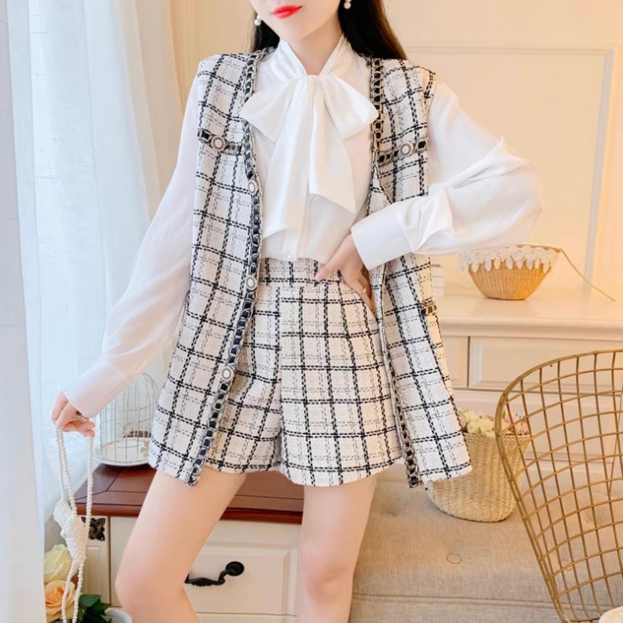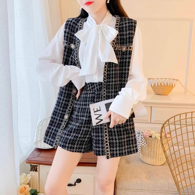 SU-0138 チェック柄 ショート丈 パンツ シャツ シフォン ベスト トップ スリーピース 上品 長袖 トップス リボン セットアップ シンプル 可愛い お洒落